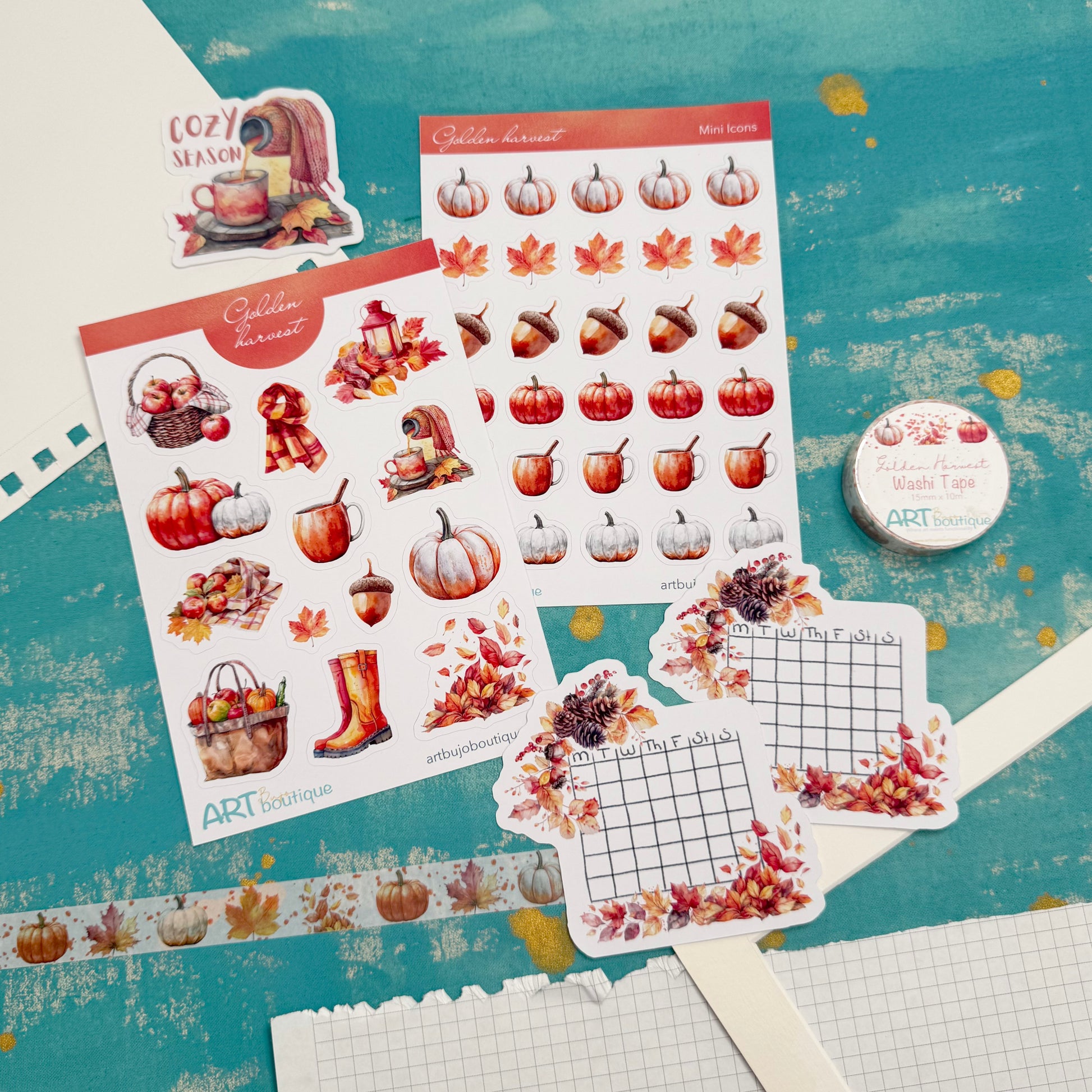 The complete Autumn Collection in one ultimate bundle—stickers, washi tapes, bookmarks, notepads, postcards, and vinyl stickers. Perfect for cozy journaling and seasonal planning.